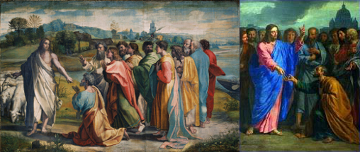 En regard de l'hostilité ahurissante de Moana Weil-Curiel-je-m'écoute-et-je-me-convaincs à mon égard (plus en définitive qu'envers ma comparaison), que penserait-il du rapprochement de La Remise des clefs à saint Pierre de la cathédrale de Soissons, et le carton fameux de Raphaël, rapprochement rappelé dans le catalogue de l'expo de Lille, où les oppositions l'emportent pourtant : différence de matières et de destination entre une toile d'autel et un carton pour tapisserie, différence de format, tableau vertical contre carton horizontal ; composition latérale contre composition en profondeur ; tous les apôtres sont de profil chez Raphael, de face chez Champaigne ; aucun rapprochement possible entre les gestuelles du Christ, ni celles de saint Pierre ; le Christ habillé de blanc chez, Raphaêl, en rose et bleu chez Champaigne ; paysages différents, voire absence de paysage chez Champaigne ; des moutons chez Raphael, aucun animal chez Champaigne ; un monument identifiable ici, pas le moindre là…